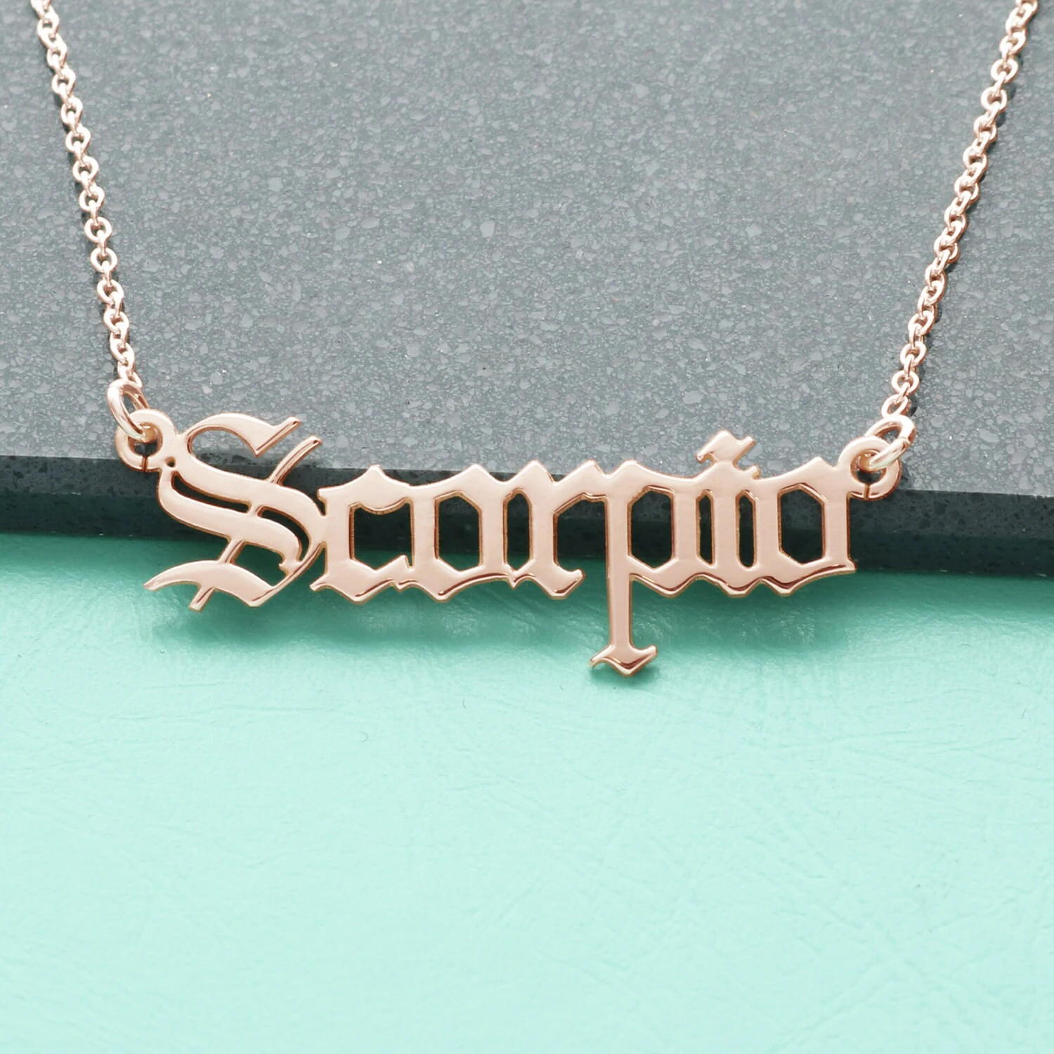 Stunning 9ct Yellow or Rose Gold Star Sign Word Necklace. Select any choice of birth sign from the options menu to wear the latest on trend ‘must have ‘ jewellery accessory. Crafted in Old English font style reminiscent of the famous Sagittarious necklace seen on tv celeb winner.