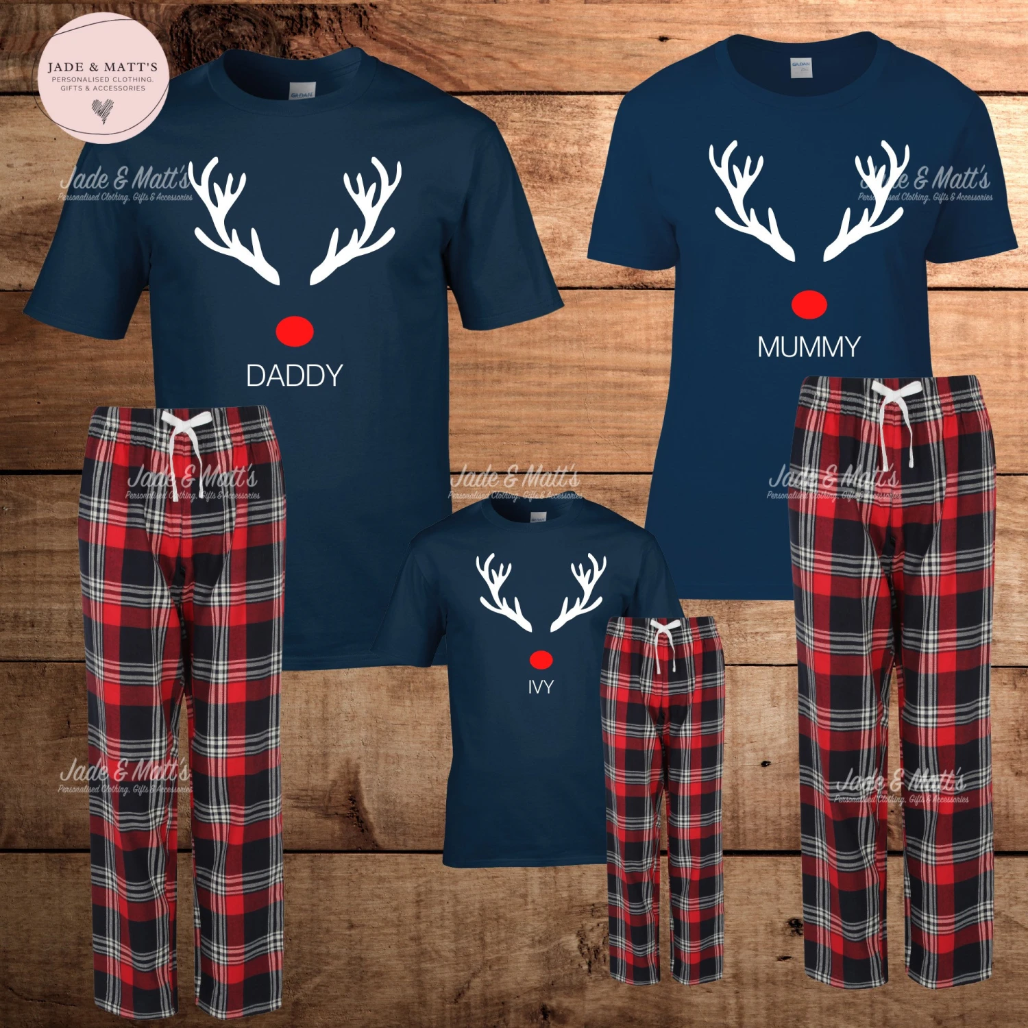 This is our Personalised Christmas family set. Navy tshirts with navy/red tartan bottoms.