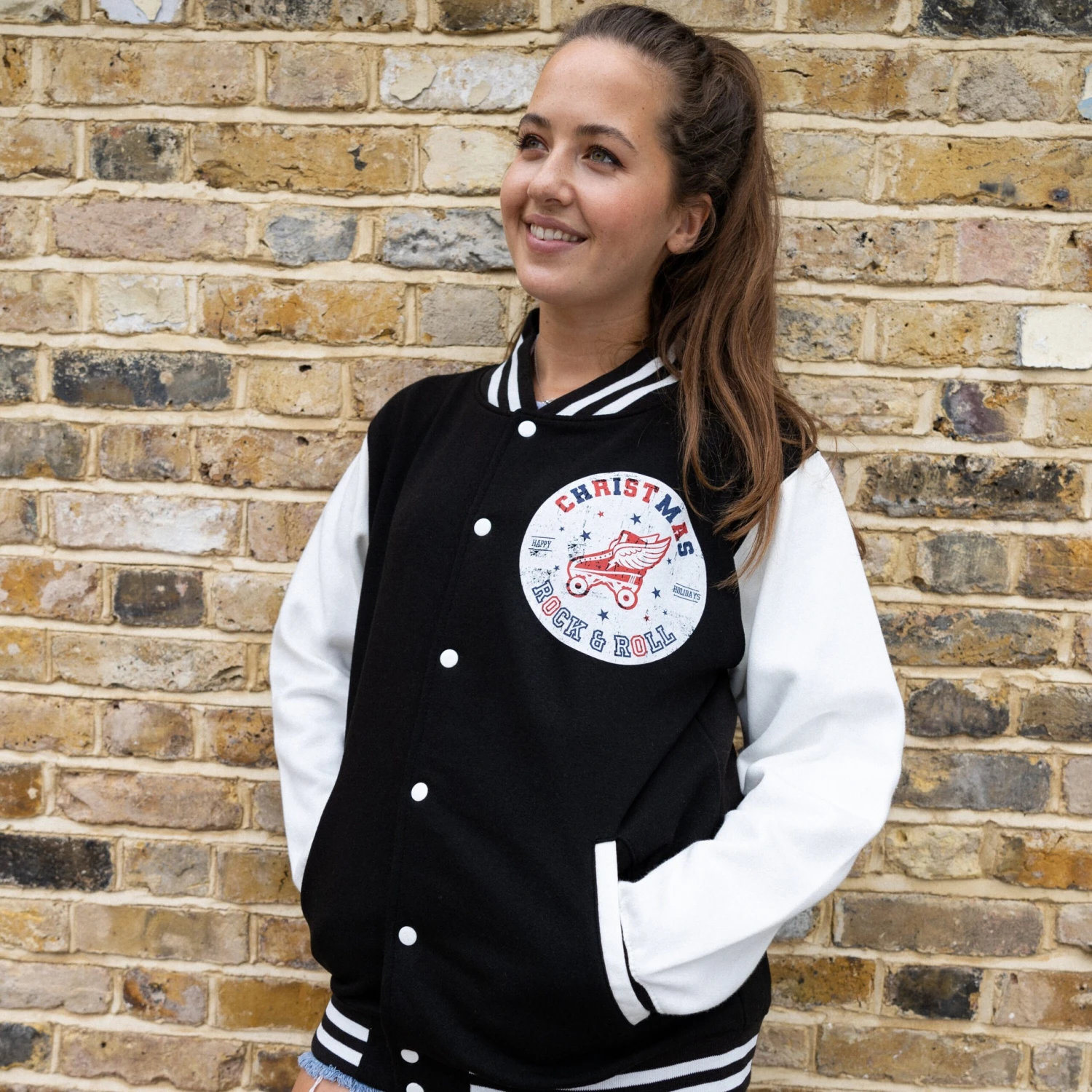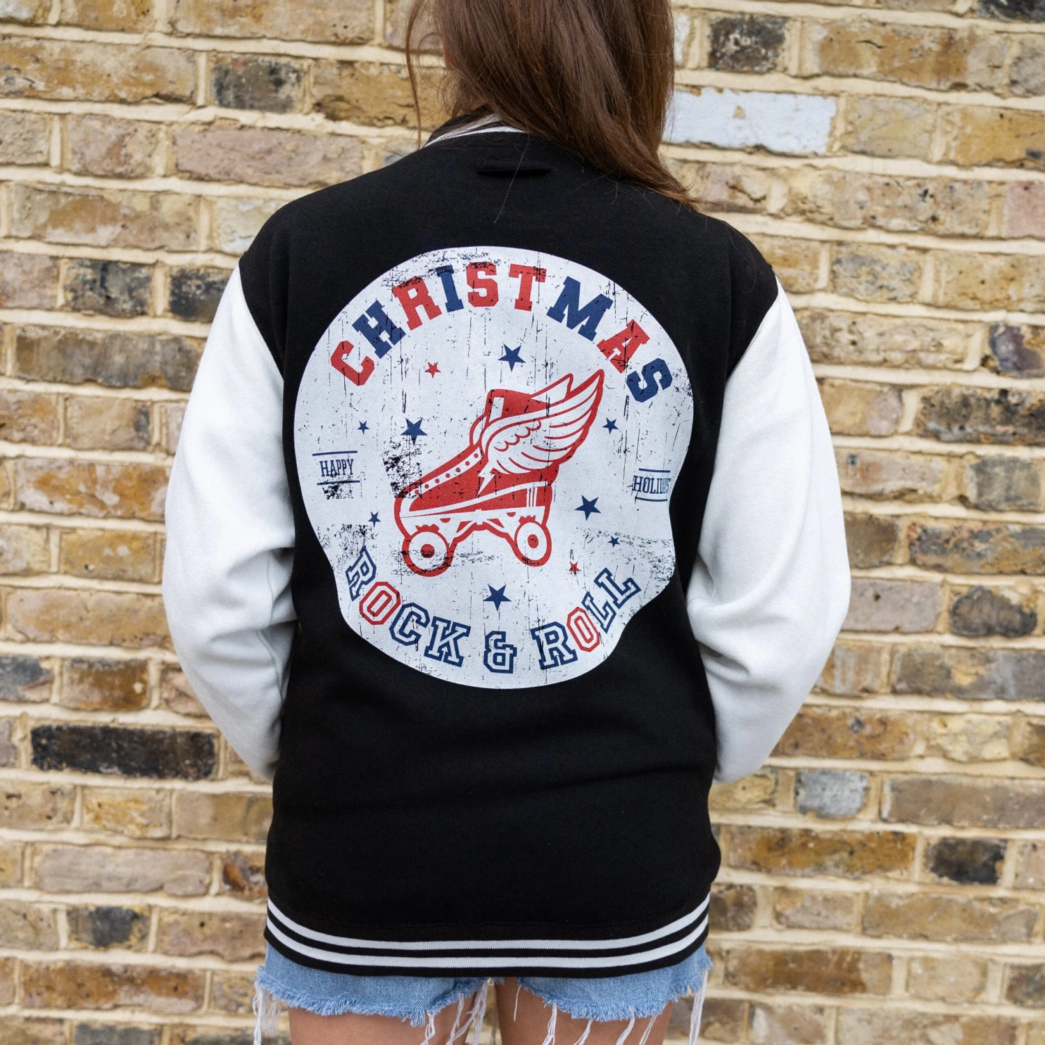 Super-soft, unisex varsity jacket with “Christmas Rock and Roll” slogan and retro roller skate graphic. Small logo on front, large back print.