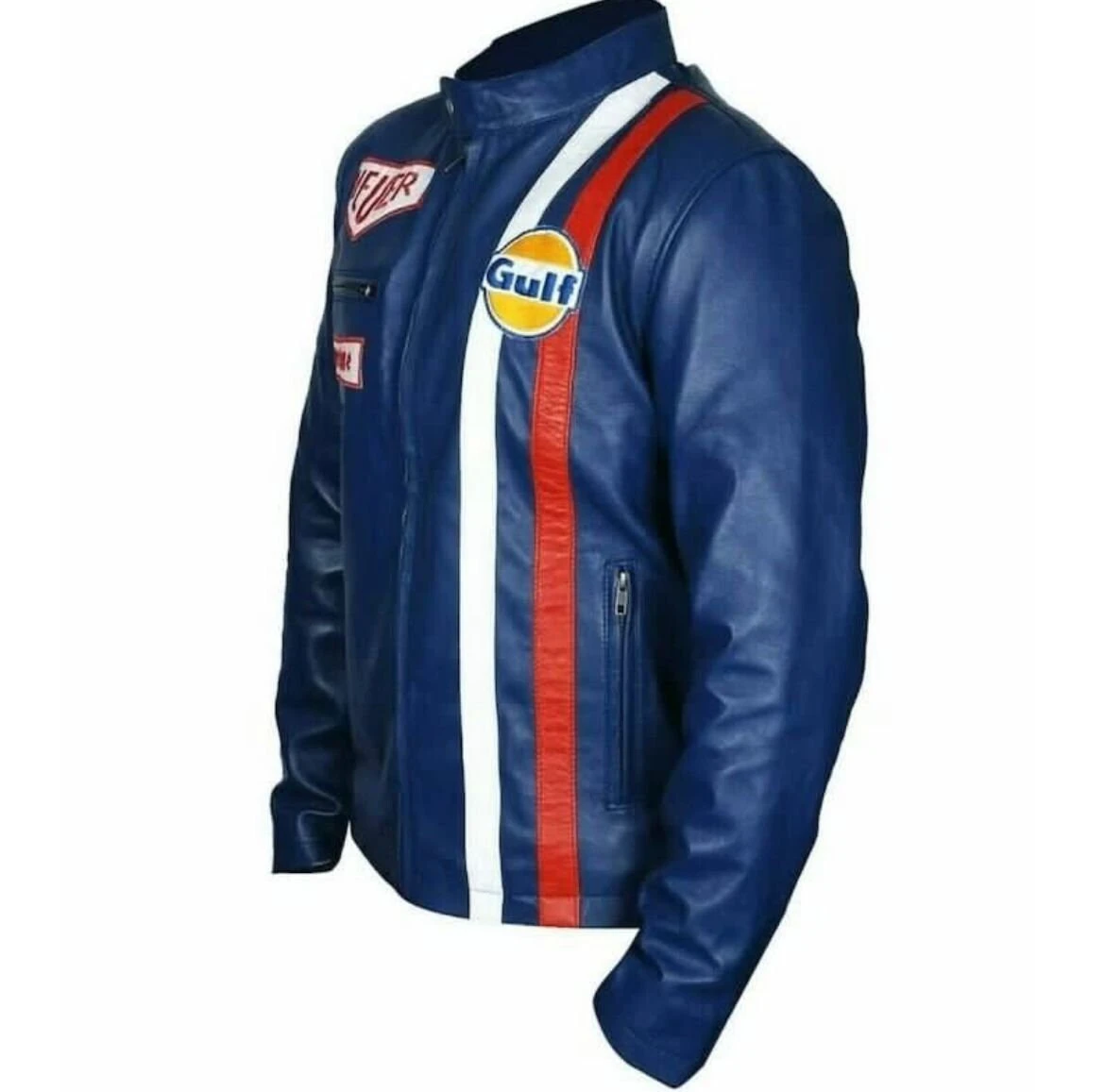 Men’s Steve McQueen Le Mans Gulf Racing Style Stripes Leather Jacket Motorbike Motorcycle Jacket Touring /christmas gift, ,unisex jacket