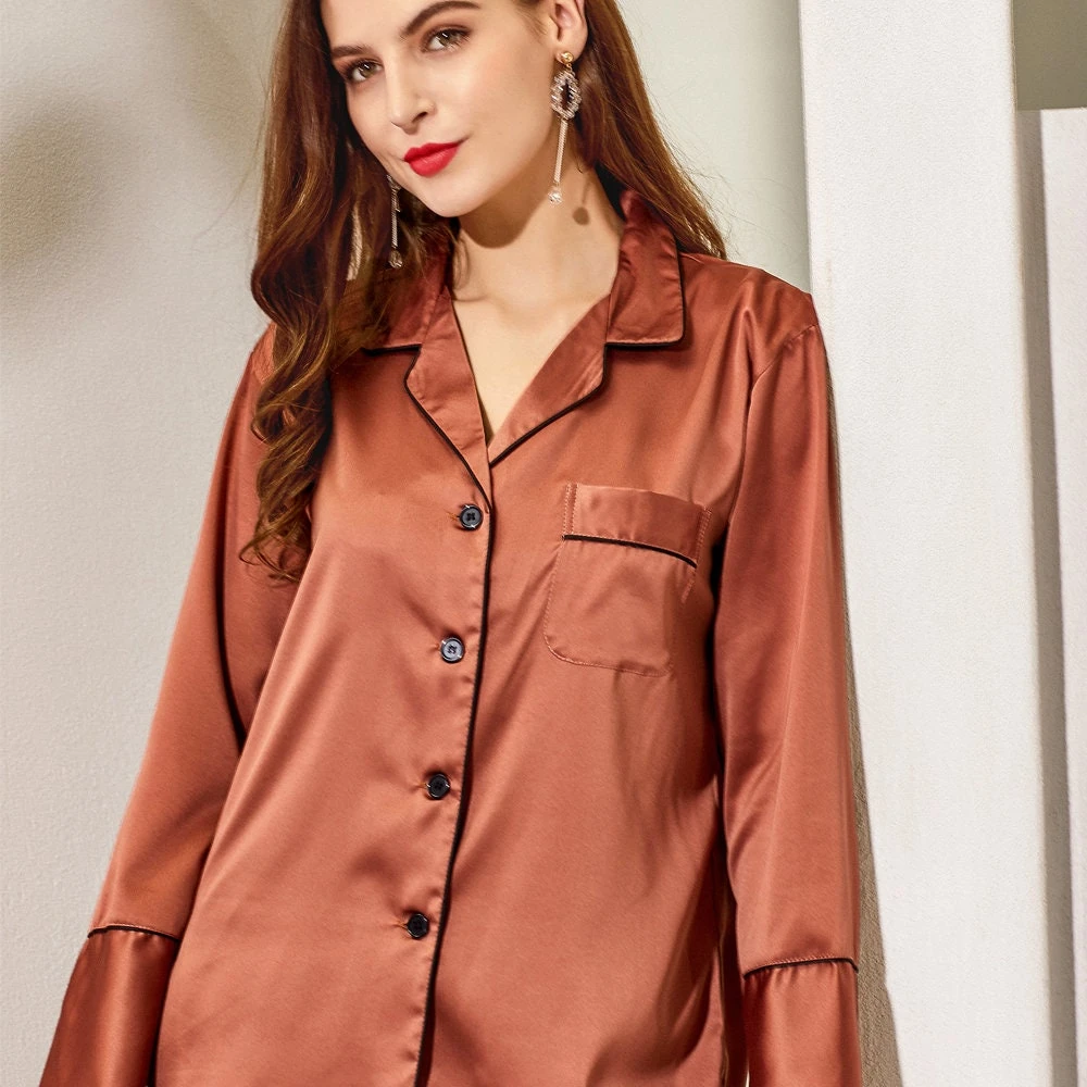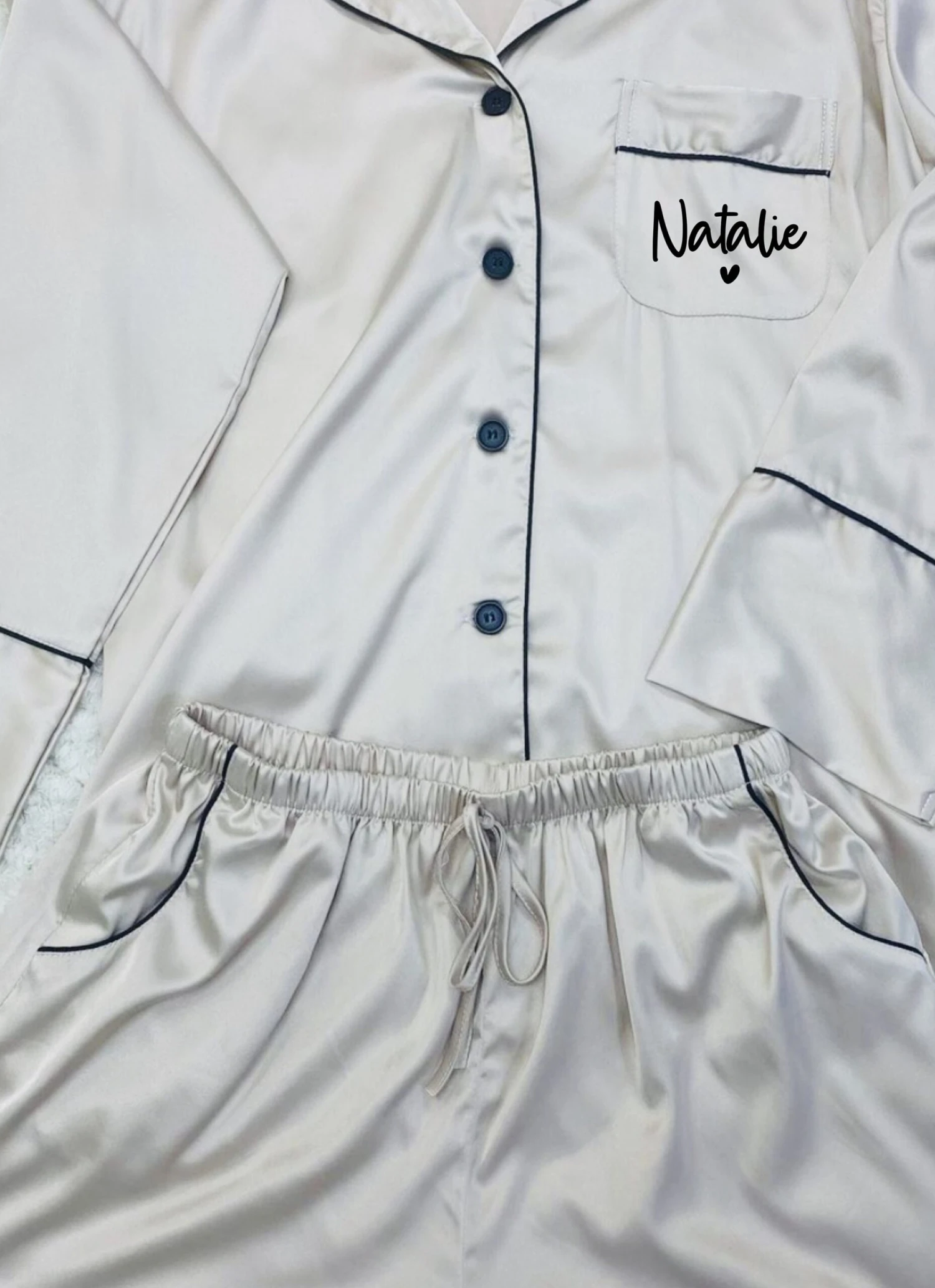 Our beautiful LONG SLEEVE/ LONG PANTS satin pyjamas make the perfect customised gift and are especially popular as bridesmaid pyjamas, and girlie spa weekends/sleepovers