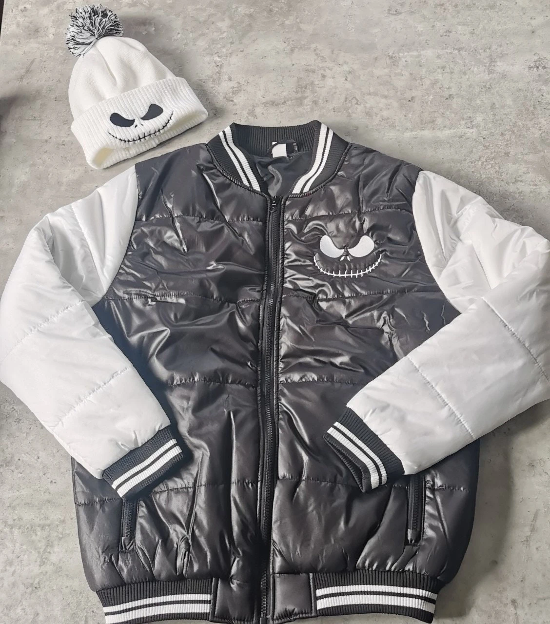 Oogie Boogie Black White Unisex Puffer Baseball Winter Coat Varsity Jacket Hoodie Hoody Jack Skellington Nightmare Before Christmas NBC Tim Burton Gender Neutral Zippy Sweater Sweatshirt Jumper Skeleton Skull Disney Inspired Haunted Witch