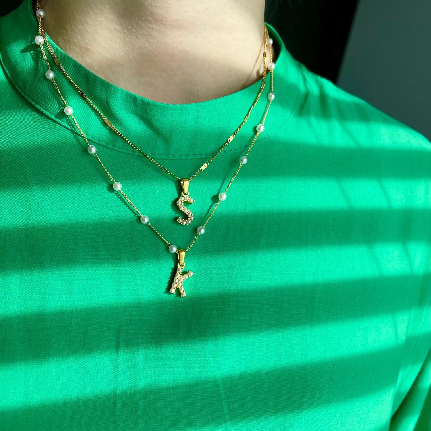 initial necklace, gold name necklace, freshwater pearl, pearl jewelry, christmas gift, gift for her, personalized gift, layer necklace, pearl letter pendant, monogram necklace, gift for mom, necklaces for her, dainty necklace
