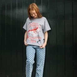 Green and navy tartan lounge pants with a grey short sleeve t-shirt top.