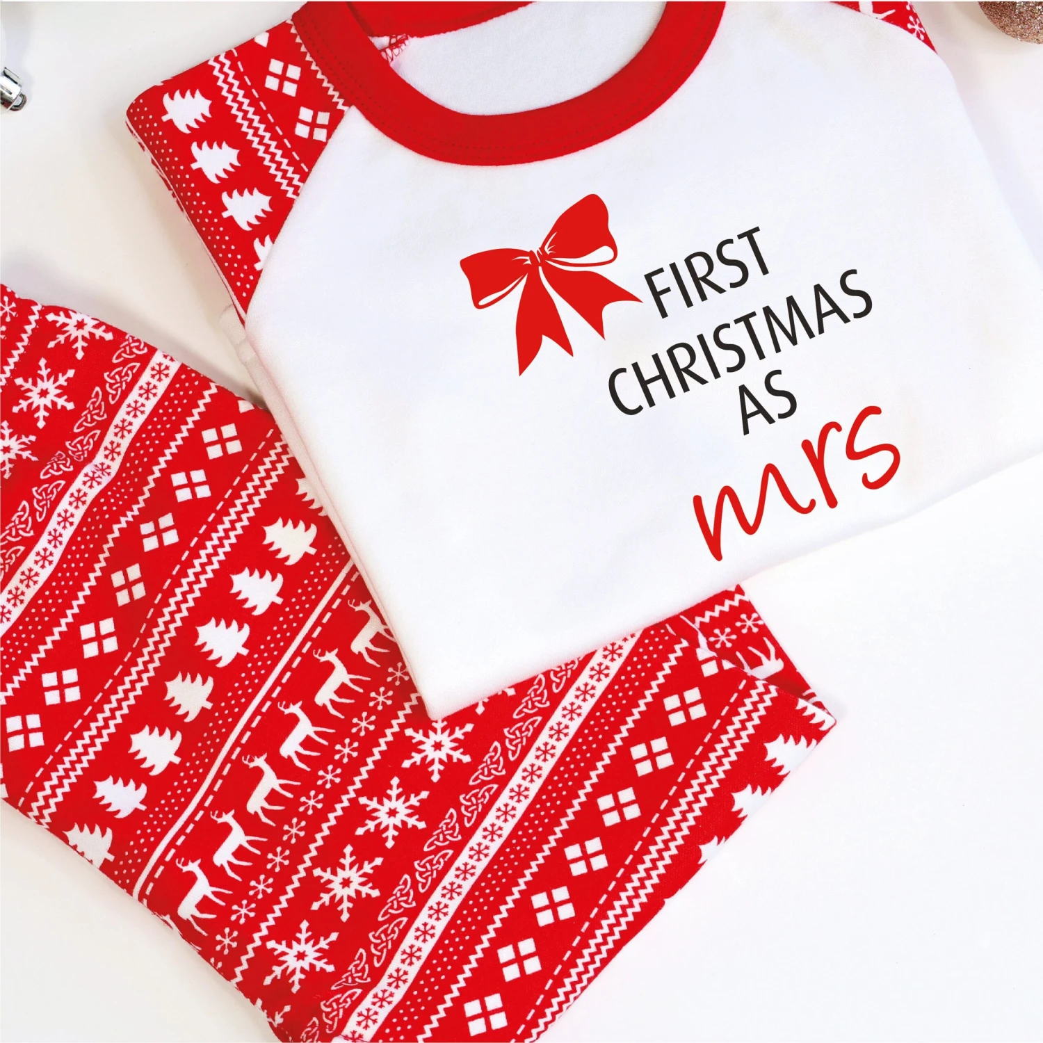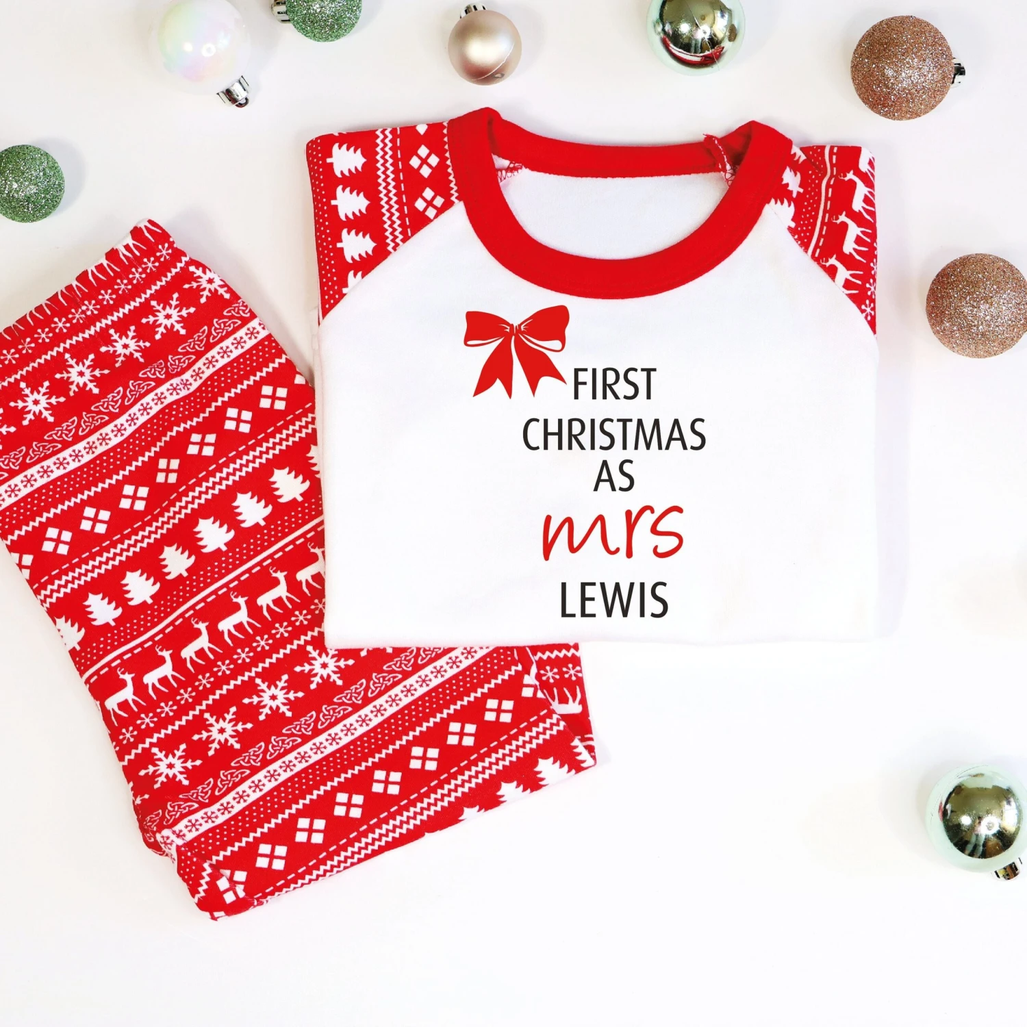 Celebrate your first Christmas as a MRS in style with our personalised 100% cotton red inspired print pyjama set that features the wording: First Christmas as Mrs!
