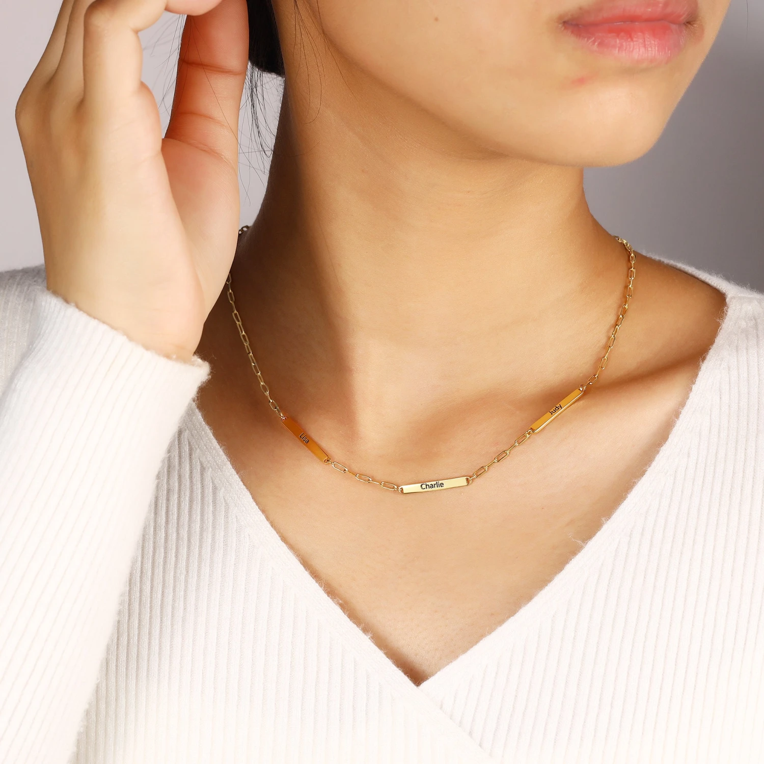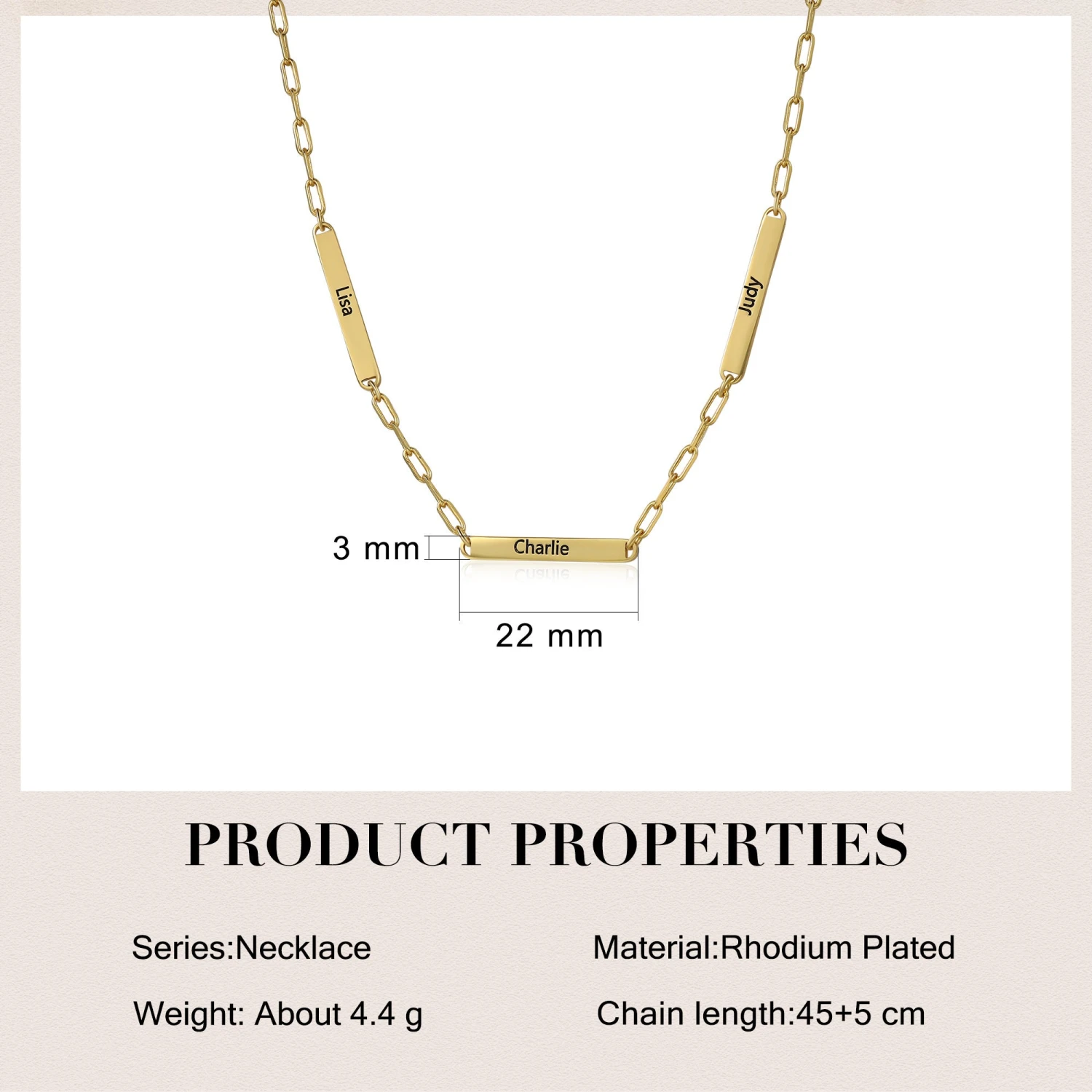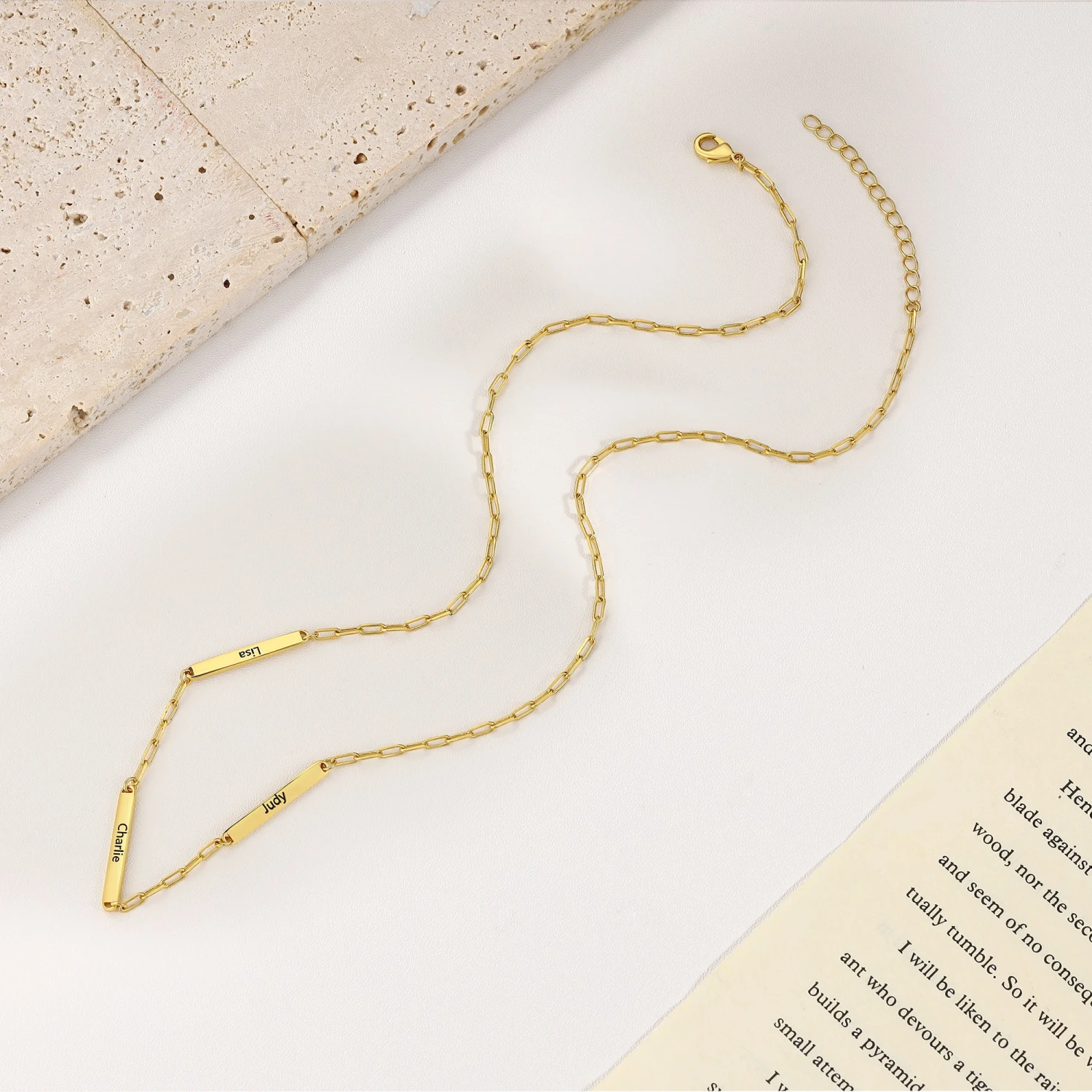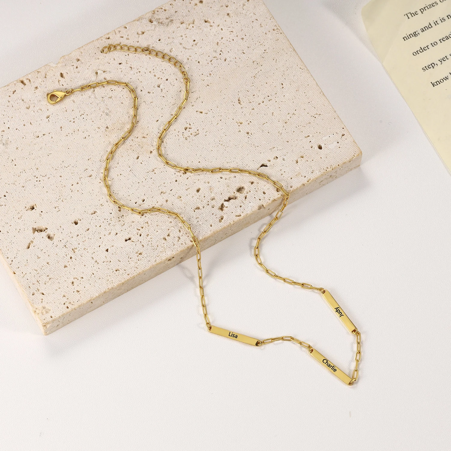 ☀The necklace is designed to be versatile, suitable for both casual and formal occasions. Its timeless appeal makes it a cherished accessory that can be worn for years to come, a constant reminder of the special bond you share with the recipient.Each name bar pendant is carefully crafted with precision, ensuring clear and legible engraving of the chosen names. The paperclip chain adds a modern and chic touch to the overall design, making this necklace a true fashion statement.
