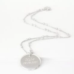 This necklace is composed of a chain mesh balls and a domed medal 20 mm. It is entirely made of solid silver, hallmark 925. Rhodium-plated finish.