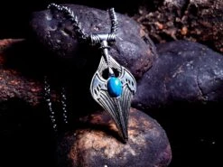 Silver-tone, this necklace is inspired by the Amulet of Kynareth from the video game Elder Scroll: Skyrim.