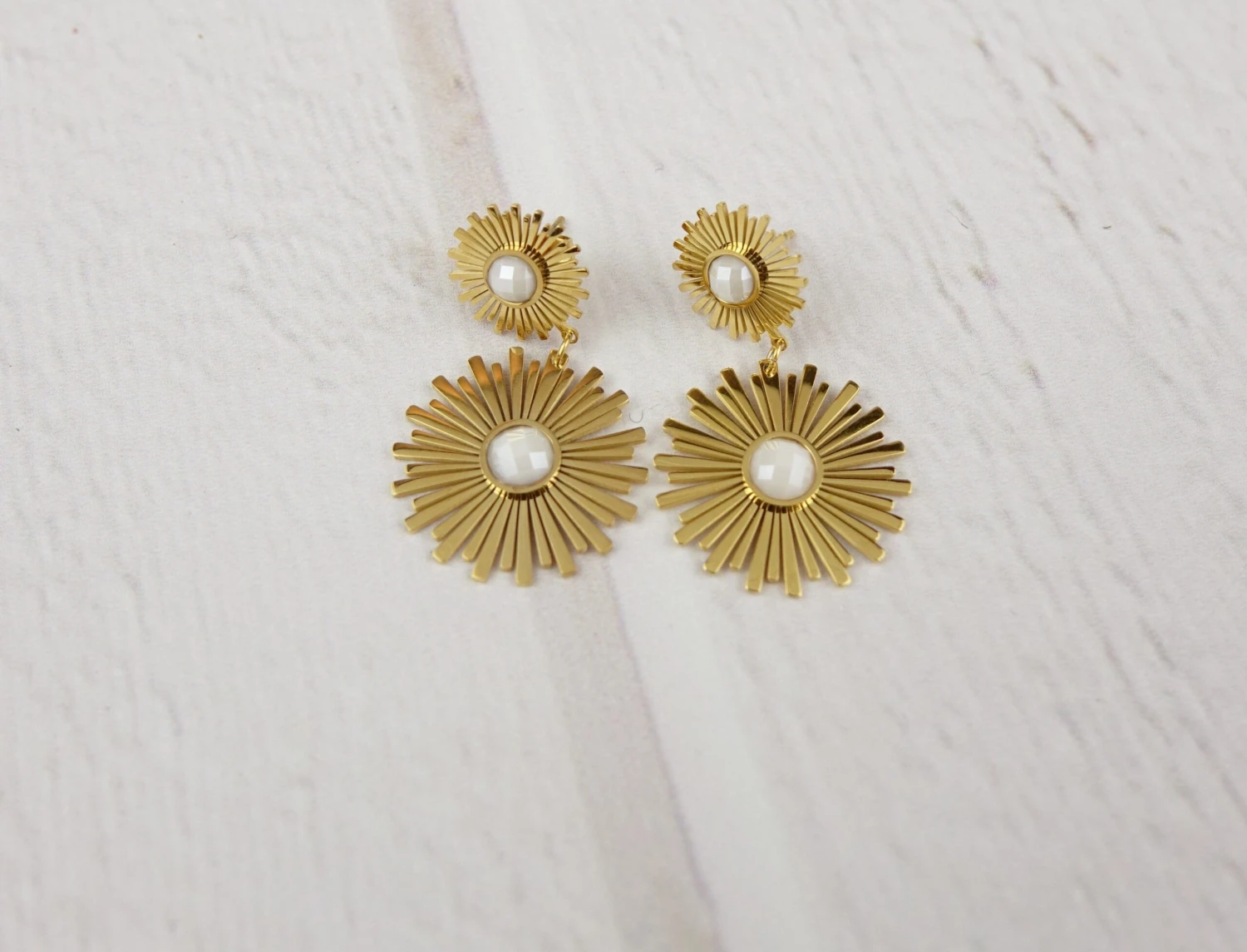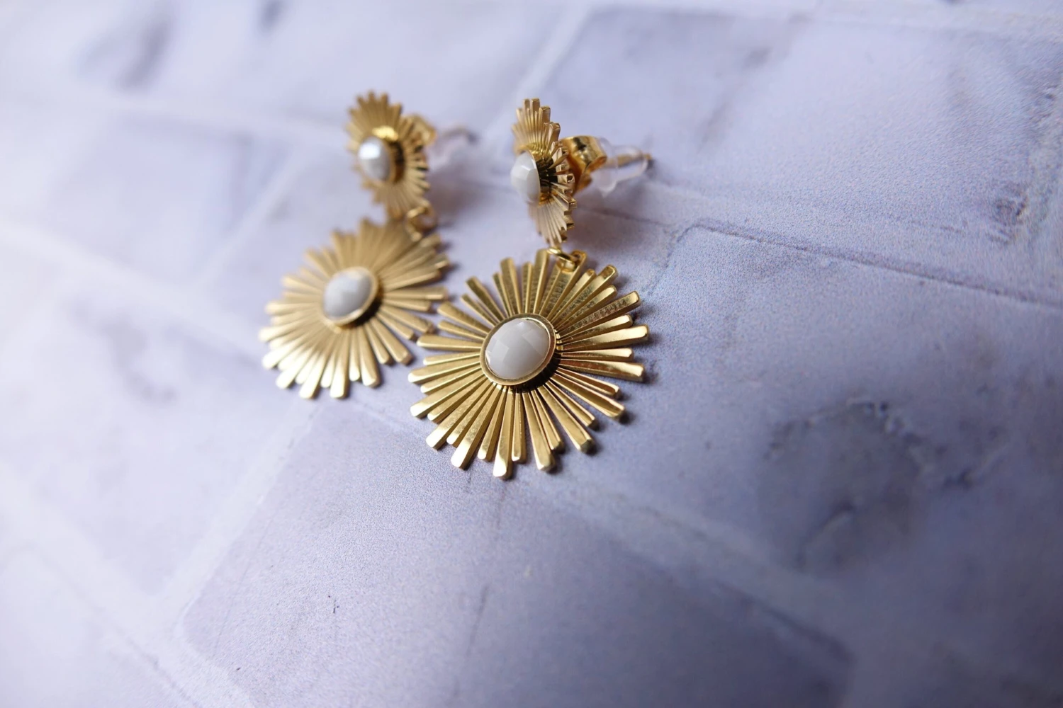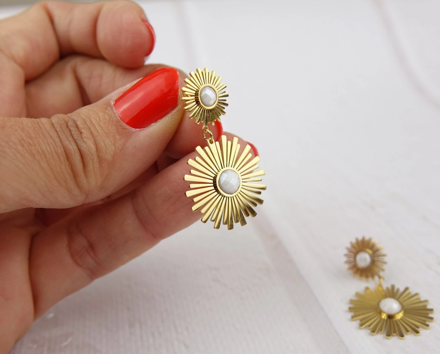 Golden sun pendant earrings, detail either in white or water green.