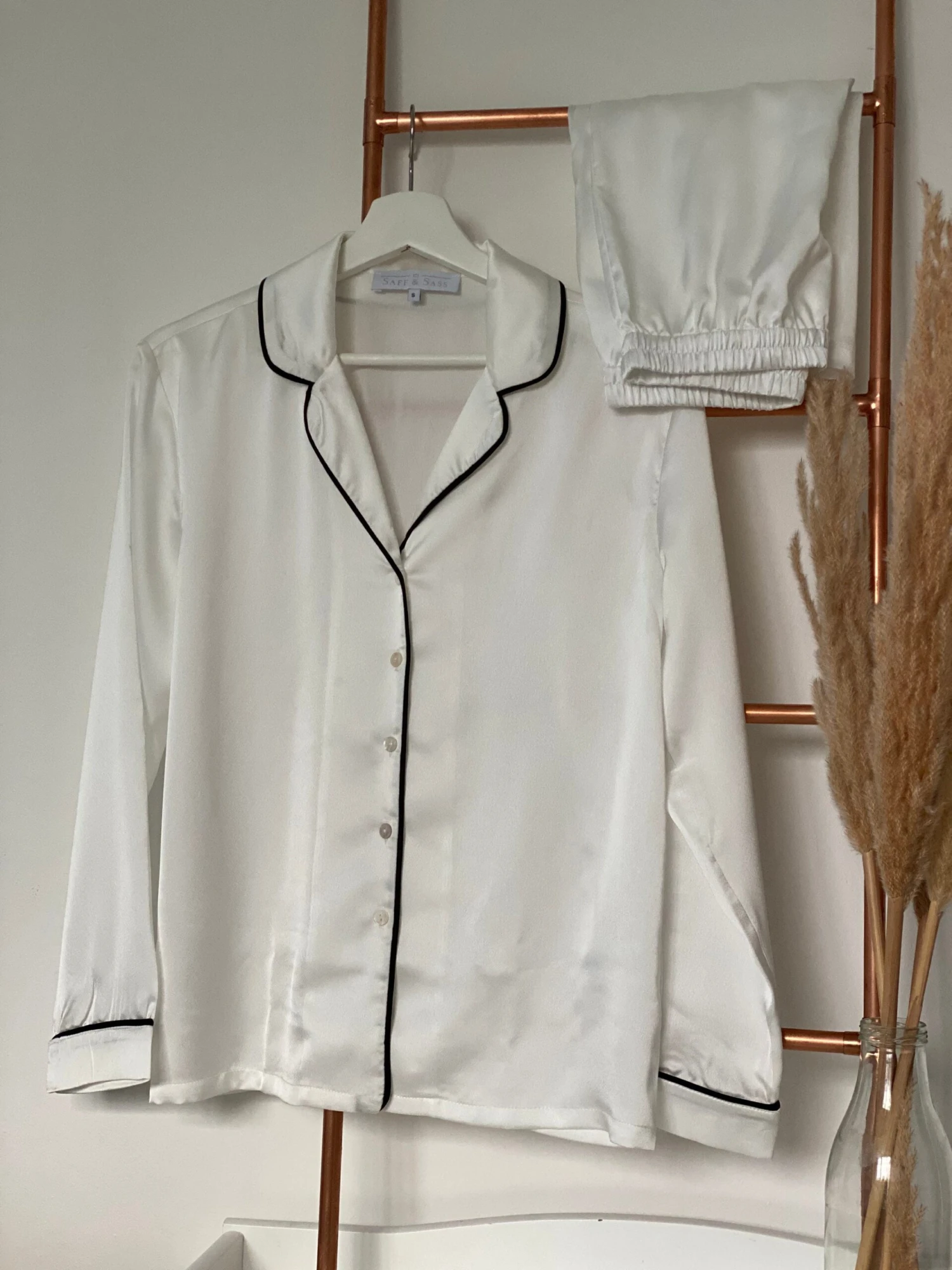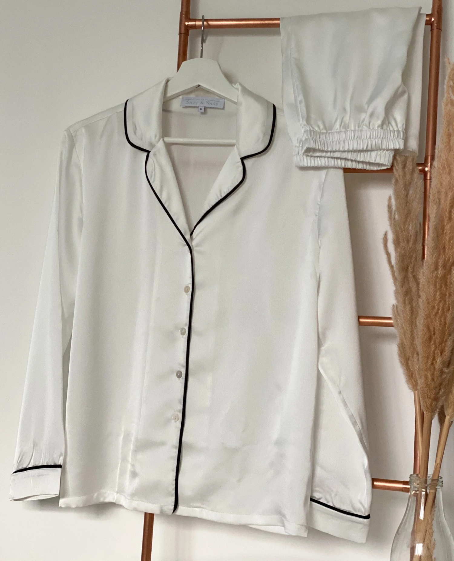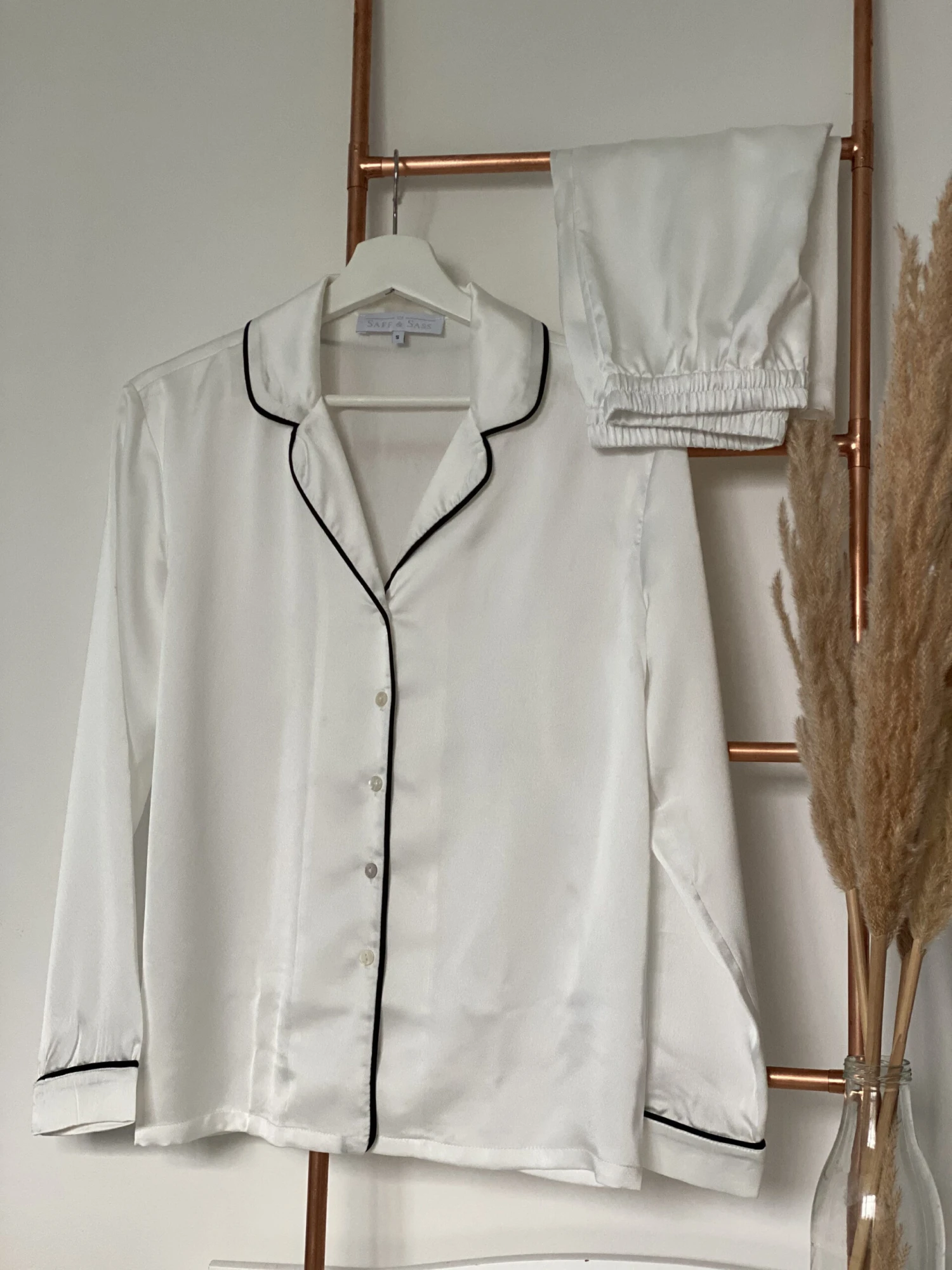 These gorgeous pyjamas are in a lovely sumptuous white with black piping on the collars and cuffs.