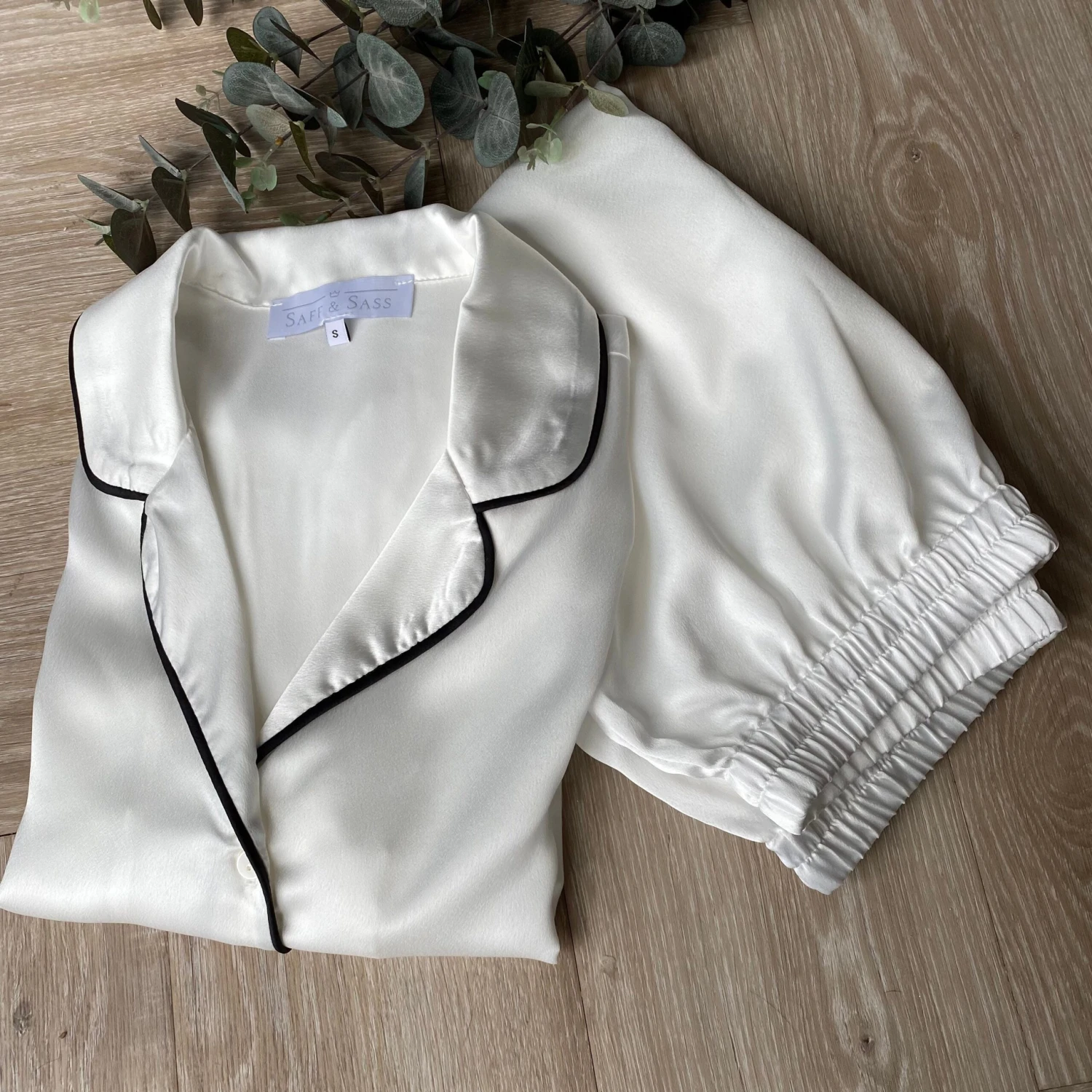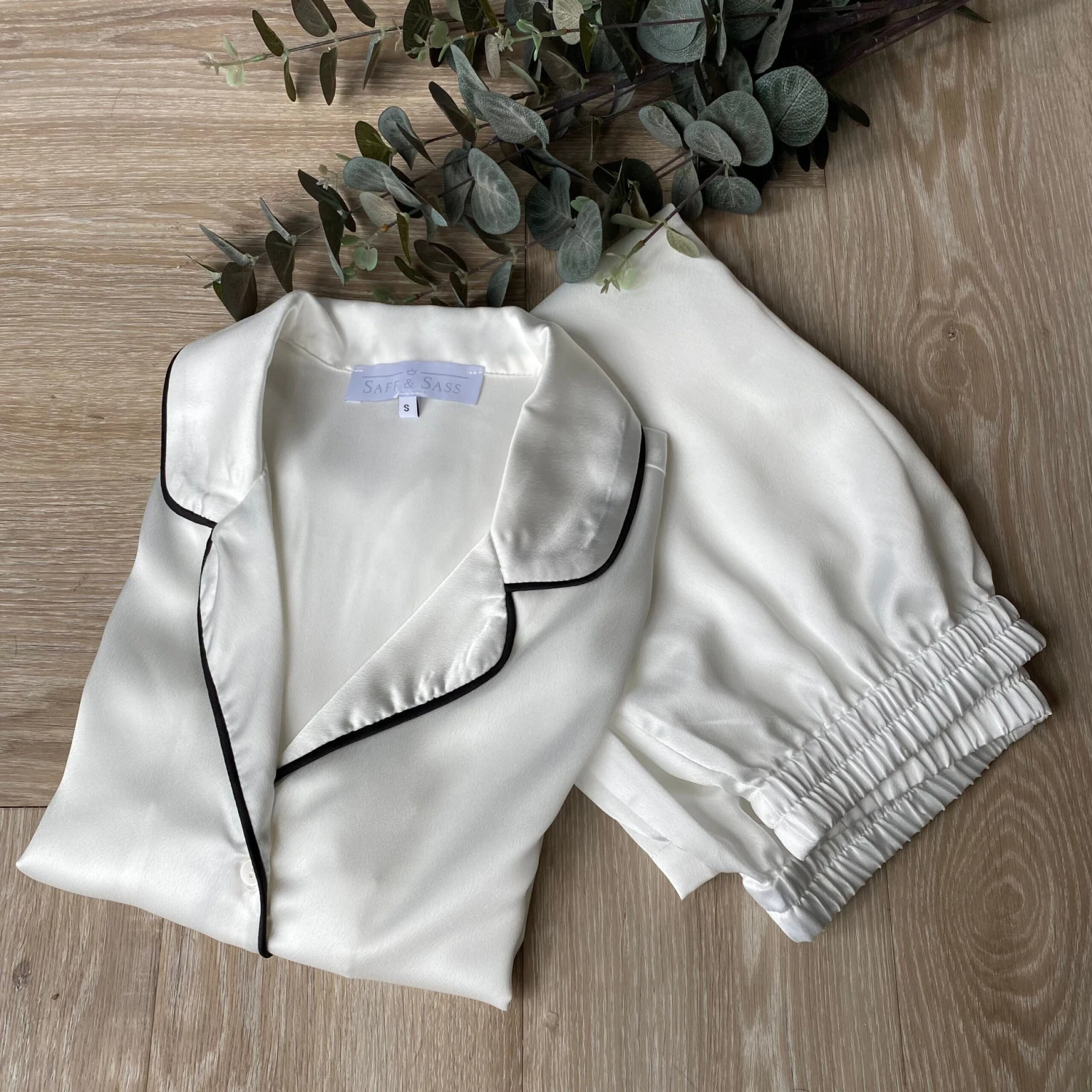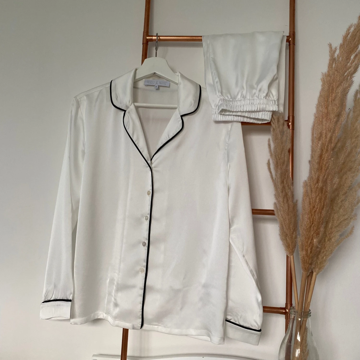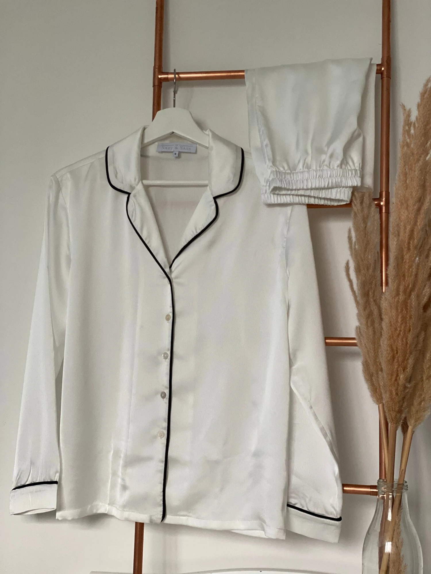 These gorgeous pyjamas are in a lovely sumptuous white with black piping on the collars and cuffs.